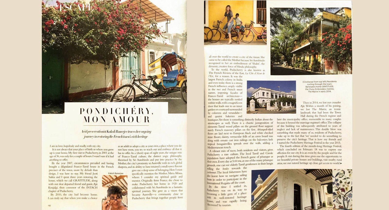 The architectural heritage of Pondy is divided by the canal, French colonial by the seafront to the south, and Tamil branching out in all directions north of the canal. Both sides offer a mixture of cultural surprises and curiosities for Susan Sonntag’s ‘voyeuristic stroller’ who enjoys savouring the city as a ‘landscape of voluptuous extremes’.